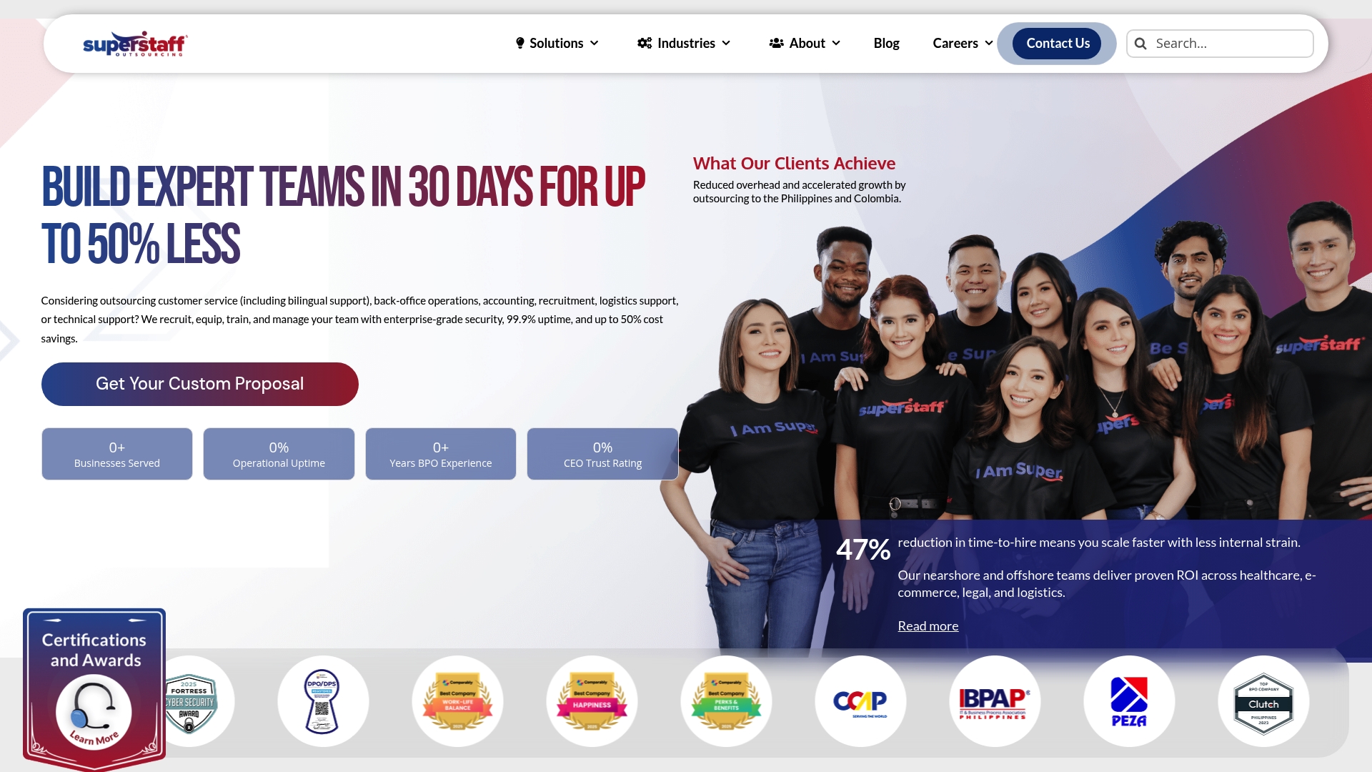 SuperStaff advertises the ability to recruit, train, and manage teams in 30 days or less, deliver up to 50% cost savings, and maintain enterprise-grade security with 99.9% uptime. The offering includes customized, industry specific training and solutions across onshore, nearshore, and offshore locations.