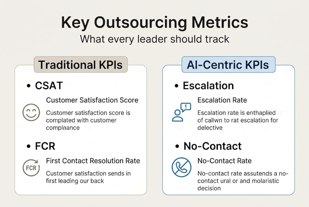 | Success hinges on quality metrics | KPIs such as FCR, CSAT, and user effort scores are essential for evaluating outsourcing provider performance. |